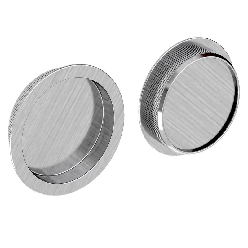 Set of 2 recessed round handles in satin finish steel.