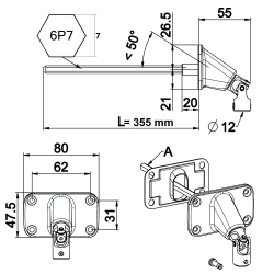 Sortie de caisson 90° embase large avec tige 6 pans de 7 mm longueur 355 mm pour manivelle de diamètre 12 mm.