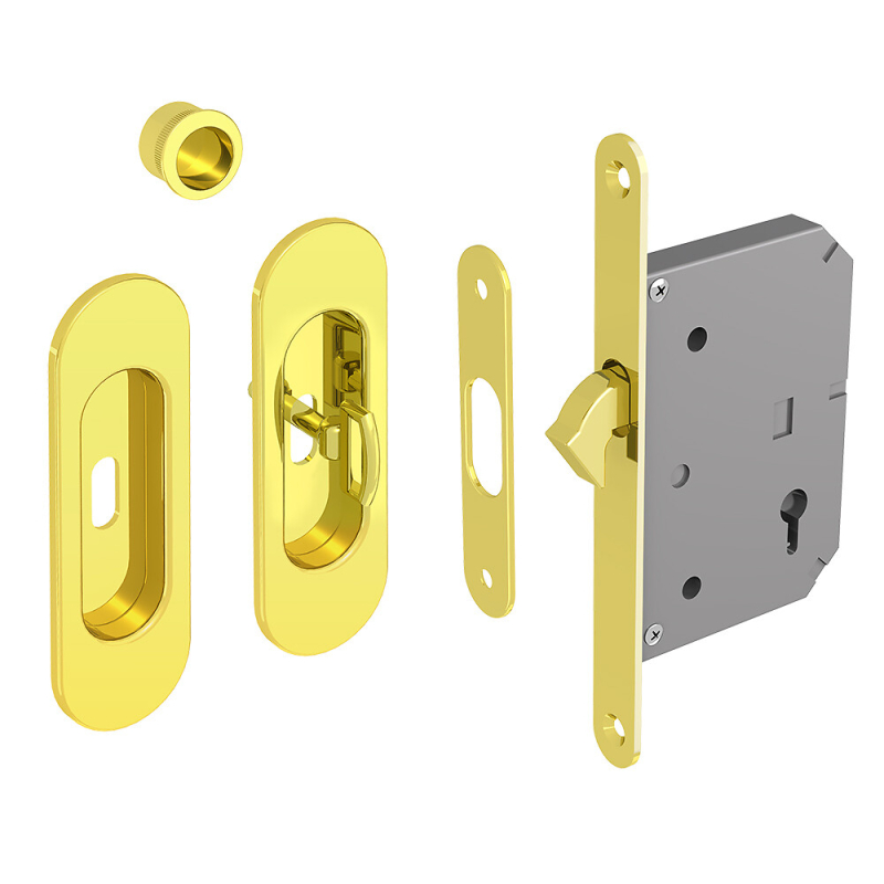 Serrure à crochet à encastrer avec poignées ovales et tire-doigt pour porte coulissante.