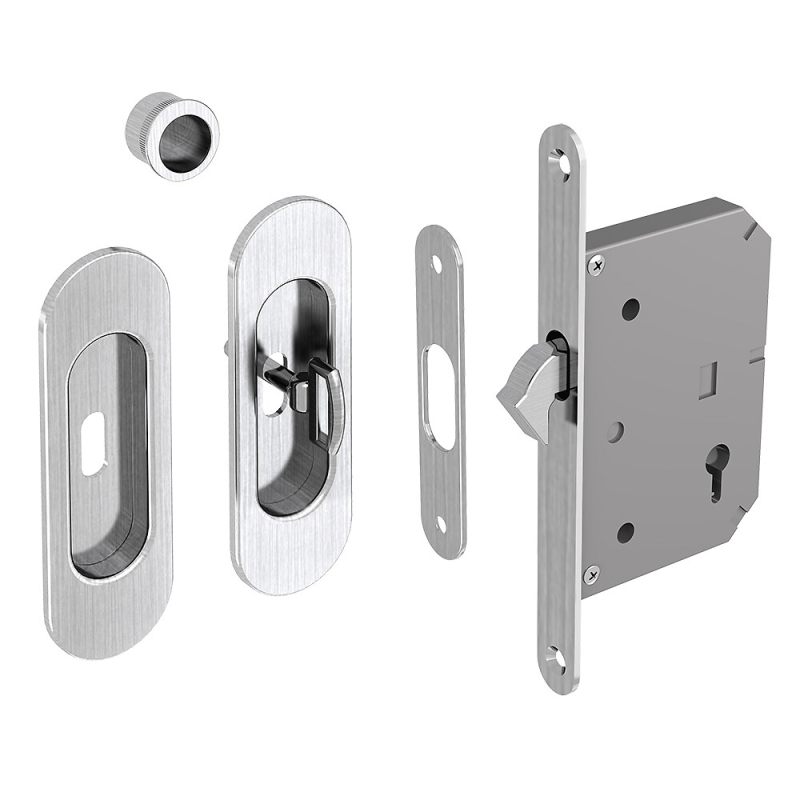Serrure à crochet à encastrer avec poignées ovales et tire-doigt pour porte coulissante.