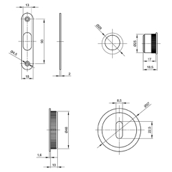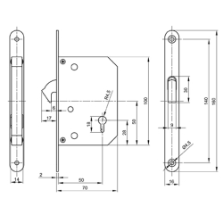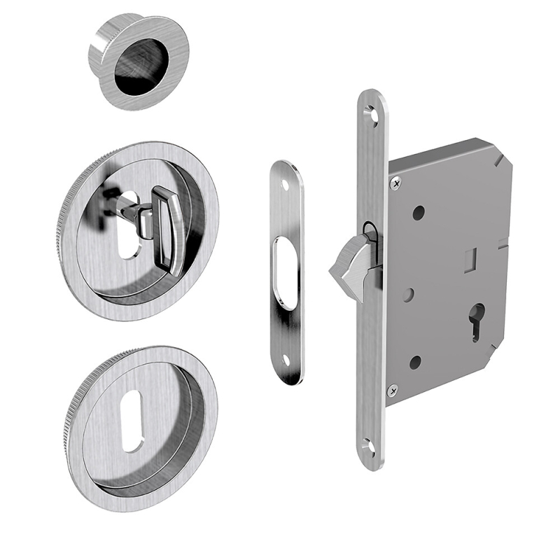 Serrure à crochet à encastrer avec poignées rondes et tire-doigt pour porte coulissante.