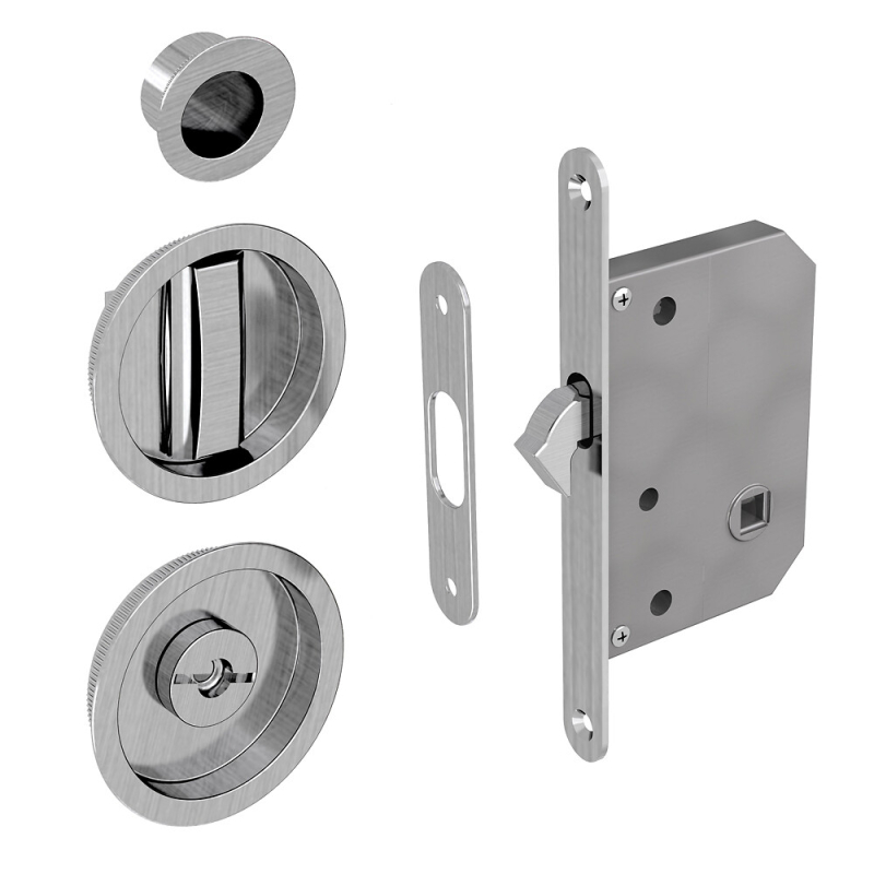 Serrure à crochet à encastrer avec poignées rondes et tire-doigt pour porte coulissante.