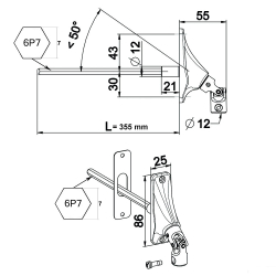 Uitgang van kast 90° smalle voet met 6-kantstang van 7 mm lengte 355 mm voor kruk met diameter 12 mm.