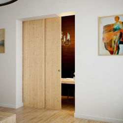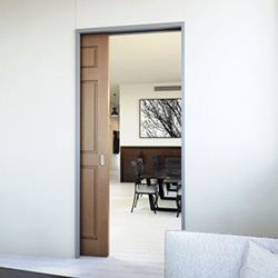Con un sistema de corredera galandage, más estético y práctico, la puerta se desliza sobre un riel alojado en el interior de un marco empotrado en la pared. La puerta desaparece por completo en la pared, ahorrando el máximo espacio y proporcionando un acabado perfecto. Los sistemas correderos diseñados para su instalación en el techo también son adecuados para su instalación oculta sin marco.