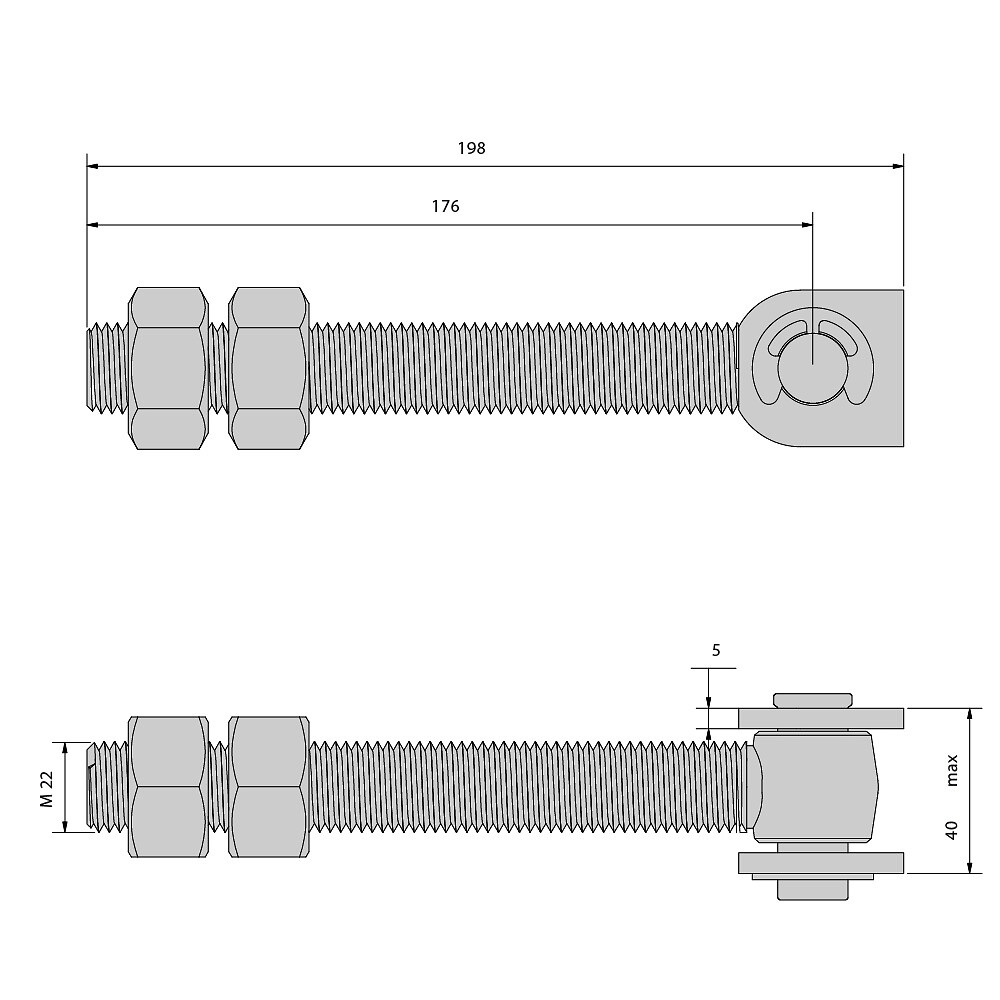 Long hinge with screw and M22 weld-on clevis – 200 kg