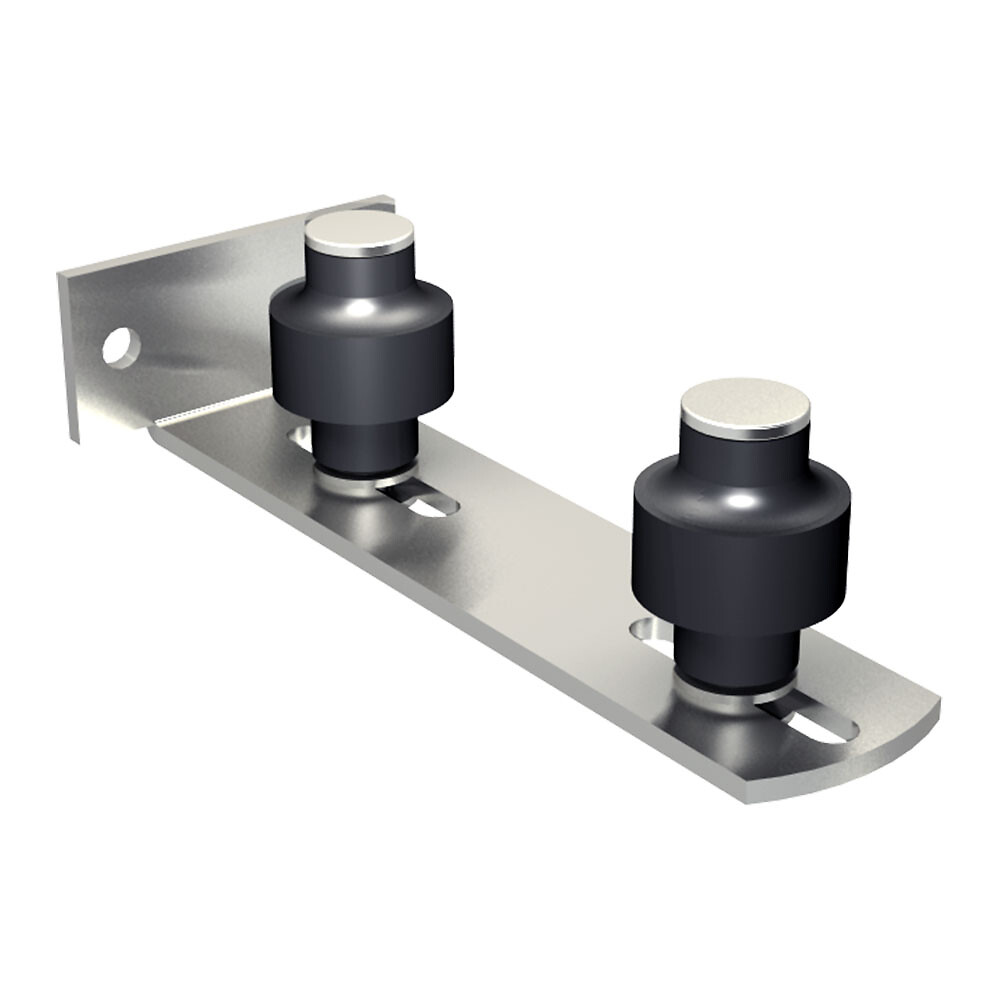 Guía ajustable para atornillar en acero cincado para puerta corredera exterior con 2 olivas de zytel Ø45 mm.