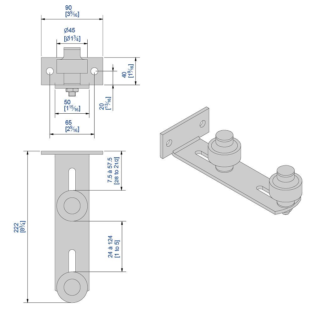 Guiador regulable para atornillar con 2 rodillos zytel Ø45 mm para puerta de hasta 900 kg